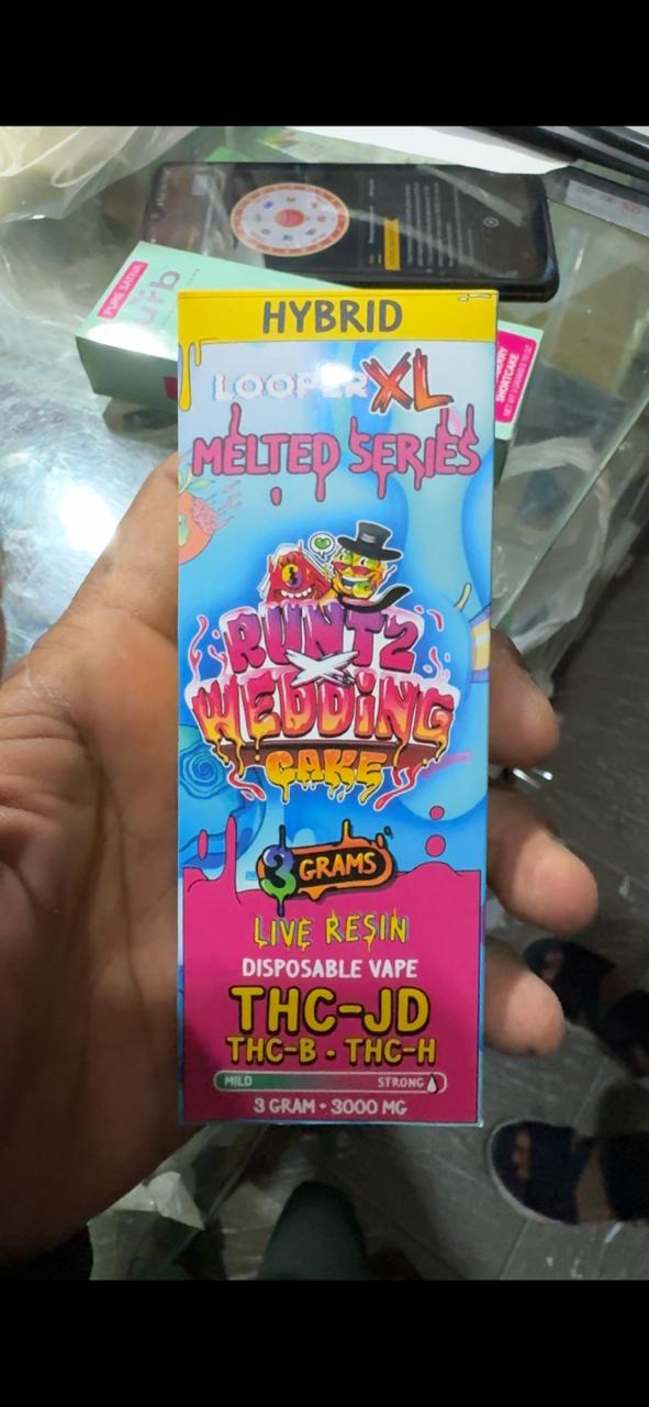 Elevate your cannabis experience with Runtz Wedding Cake Looper XL Melted Series Vape. This premium 3g cartridge combines THC-JD, THC-B, and THC-H for a uniquely balanced high, delivering euphoria and relaxation in perfect harmony. Crafted for discerning connoisseurs, the blend offers a smooth, flavorful journey with each inhale. Immerse yourself in the rich, aromatic clouds of this expertly crafted concoction, designed to push boundaries and redefine pleasure. Whether you’re a seasoned enthusiast or a curious newcomer, this vape promises an unparalleled journey through the exquisite nuances of cannabis. Unleash the potential of your senses with every puff by ordering Runtz Wedding Cake from our online headshop.