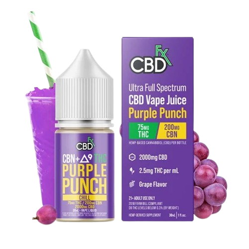 Our CBN + Delta-9 THC Purple Punch Vape Juice delivers powerful relaxation benefits for the mind and body.** Capturing the deep calming effects of the legendary cannabis strain Purple Punch, this THC vape juice gives you the lip-smacking flavor and “chill” of a classic mellow strain, but within the legal limits set forth by the 2018 US Farm Bill. The addition of full spectrum CBD and the potent cannabinoid, CBN, takes those effects to the next level. And with a THC vape product, you can feel these blissful benefits almost immediately!